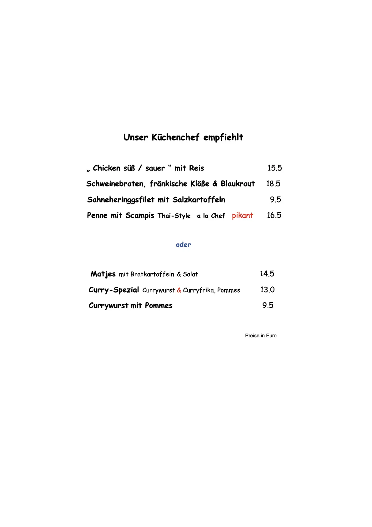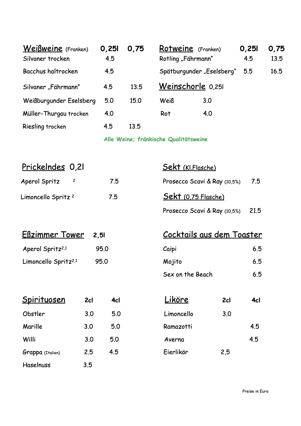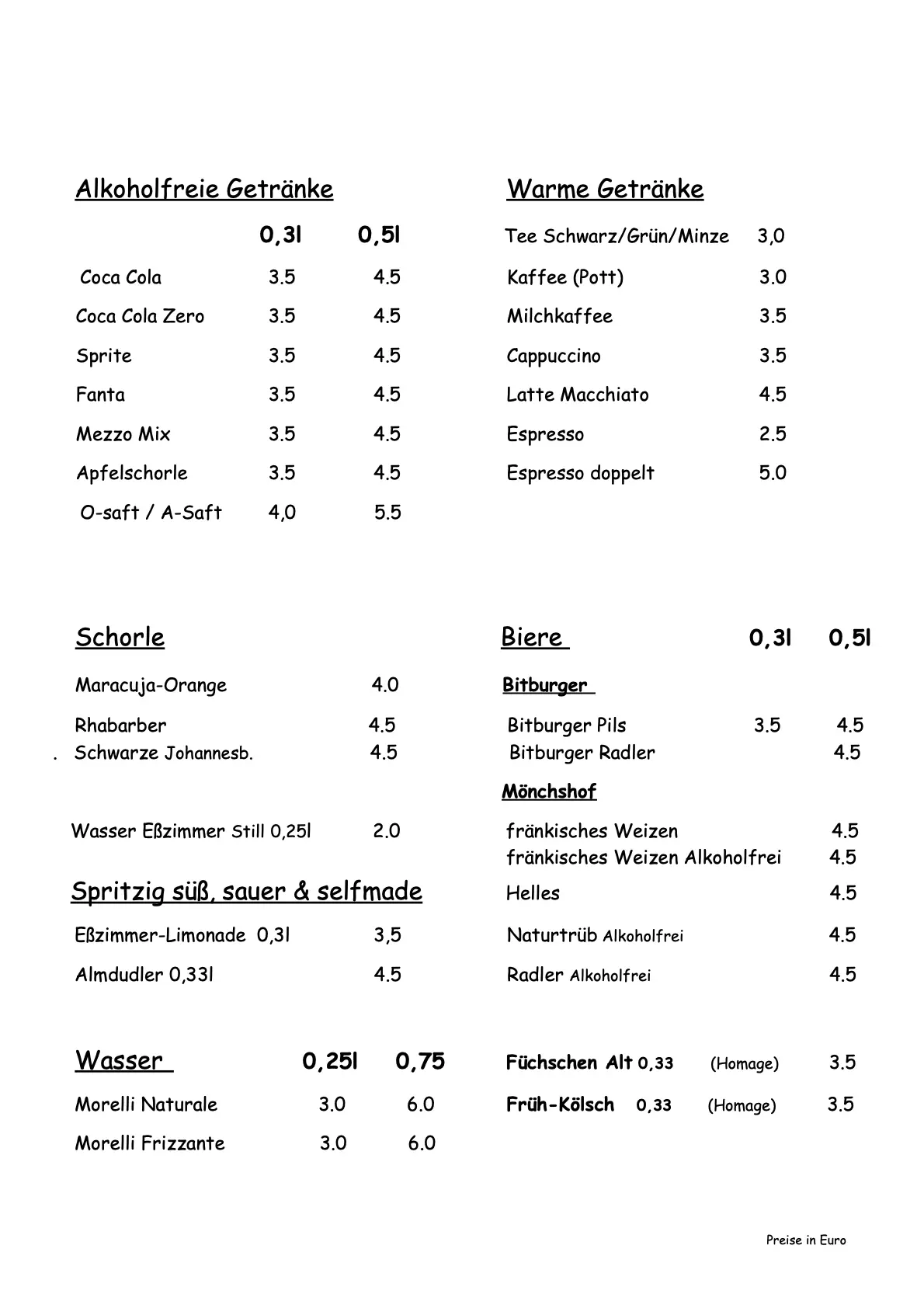 Passend zu unseren Speisen servieren wir erlesene fränkische Weine sowie ausgewählte regionale und überregionale Biersorten. Dazu gehören Mönchshof, Füchschen Alt, Bitburger Pils und Früh Kölsch.
